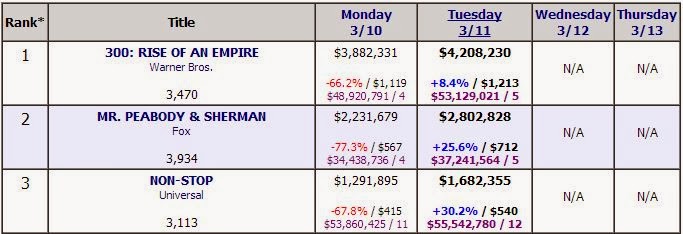 Here’s another way to think about it - given that a certain amount of money is spent on movies in domestic theaters on any given day, what percentage does a particular movie represent, and how does that percentage change? Sure, Non- Stop made $1.3 million on Monday and $1.7 million on Tuesday, but did it really do any better on Tuesday? Aren’t there just more people going to the movies on Tuesday?